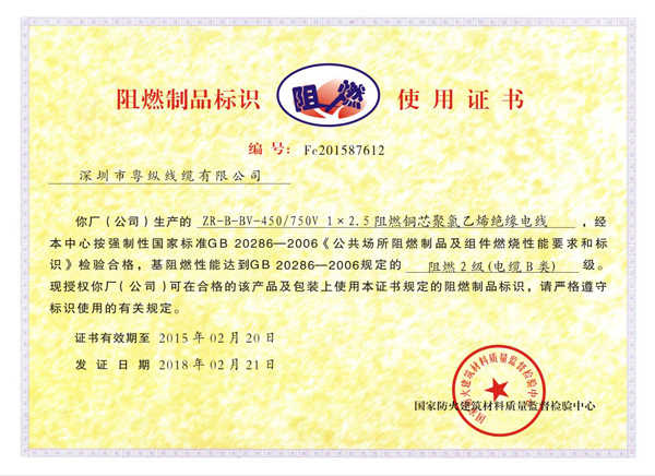 阻燃制品标识使用证书